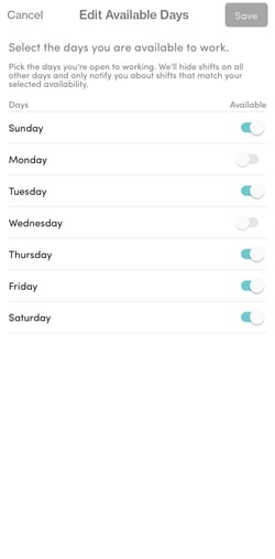 This helps ensure you only see and receive notifications for shifts that match your preferred work days.