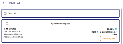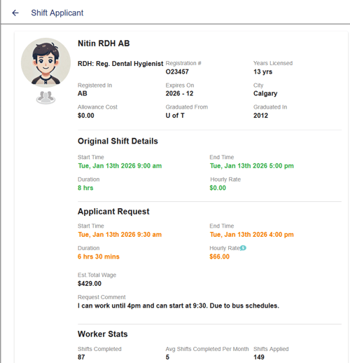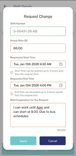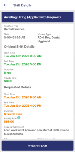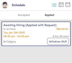 The Request and Apply feature allows professionals to apply for a shift while requesting a different wage, start time, and/or end time, all in one step. This gives both sides more flexibility while keeping expectations clear before a shift is accepted.